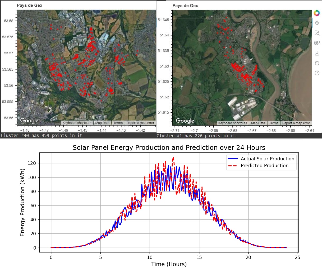 In addition to detection, we developed various machine learning models to predict solar panel energy production for a variety of sites and different future time steps.